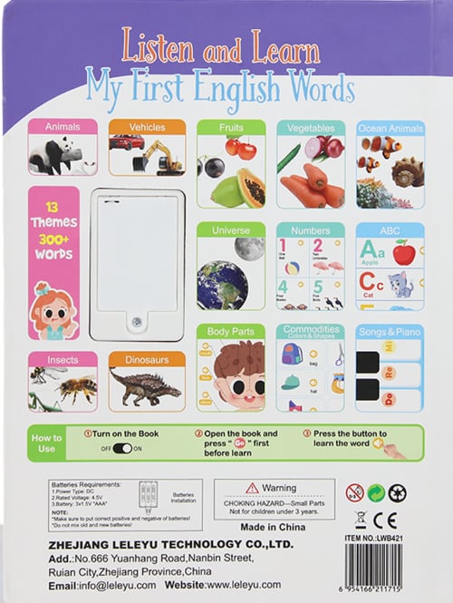 English Learning Electronic Book with 13 Topics. Prepare kids early. These toddler learning books for 1 to 3 are packed with 300 English words in preschool education topics, Animals, Things, Scenes, Transportation, Body Parts, and more.